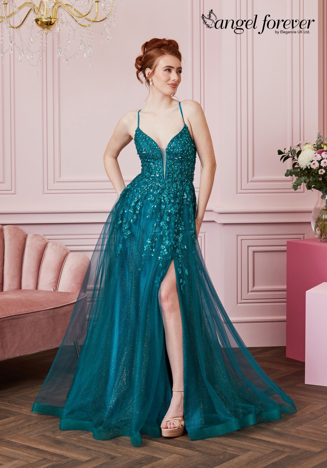 A line tulle dress adorned with embroidery and beading on the boned bodice and down the sparkling skirt with tie back and leg split.