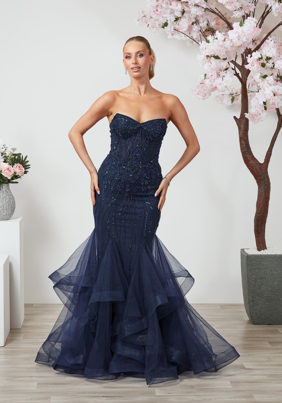 Bring on the Hollywood glamour in this highly embelloshed fishtail dress to show off that hour glass figure!  Features tie back and corset top.  You’ll look a million dollars at any event.  Available in navy, wine, rose, lemon. ice blue.