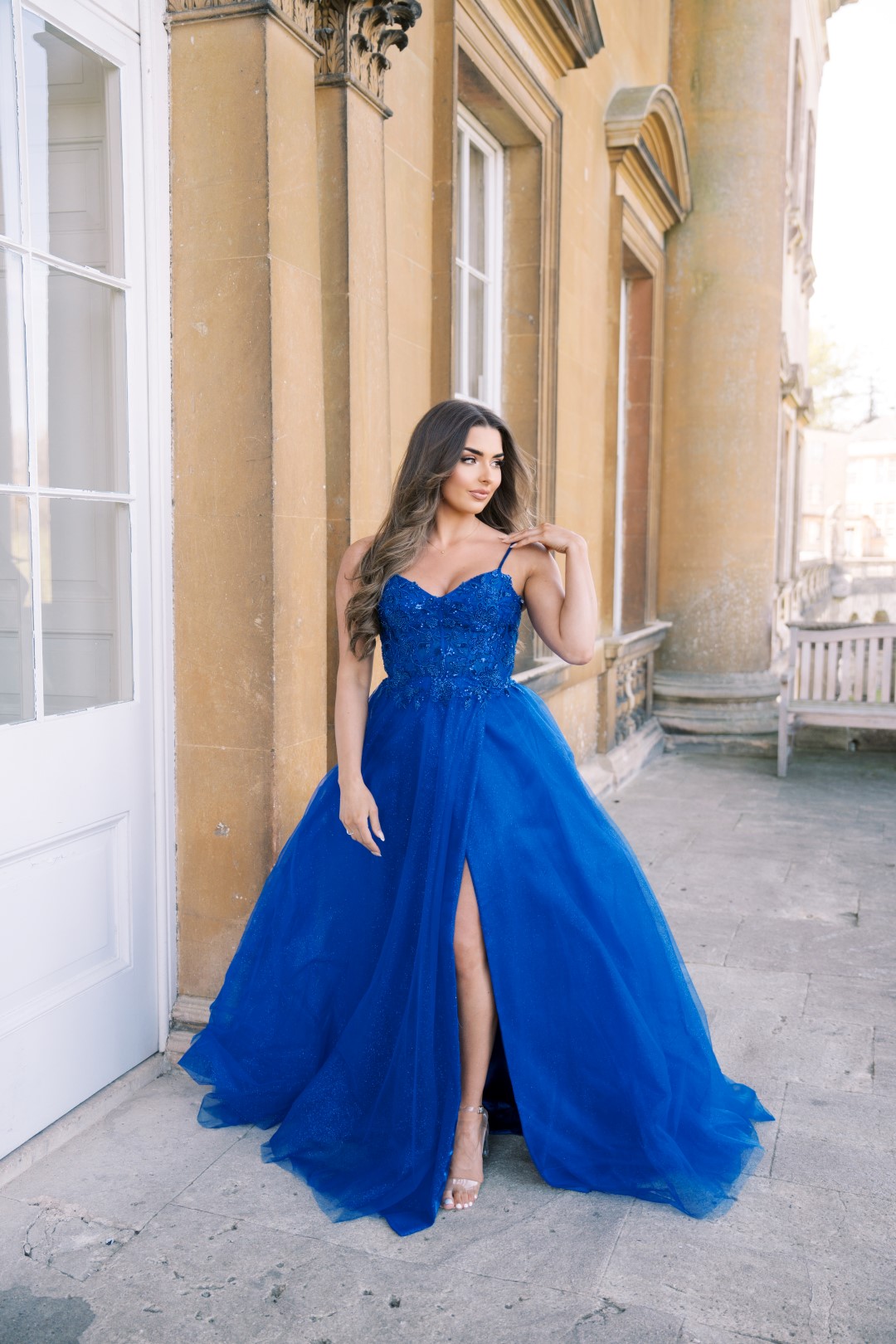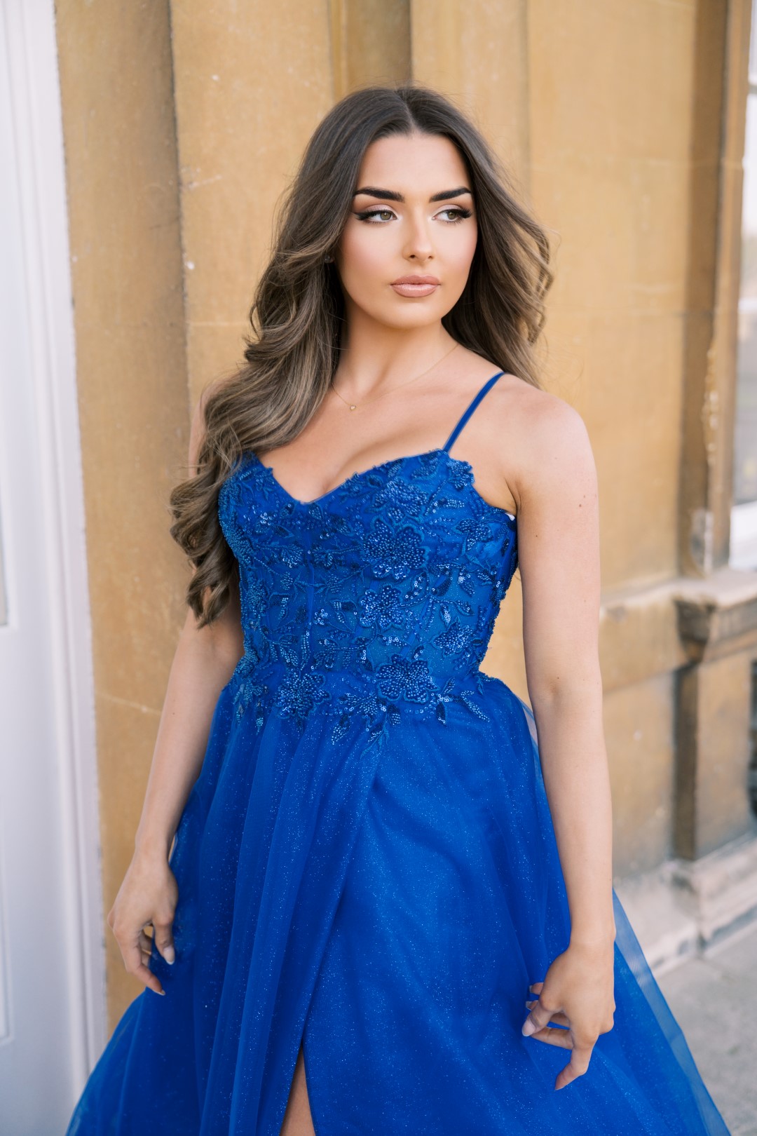 CELESTE ROYAL BLUE: A line glitter tulle gown with embellished applique boned bodice, spaghetti straps and leg split.