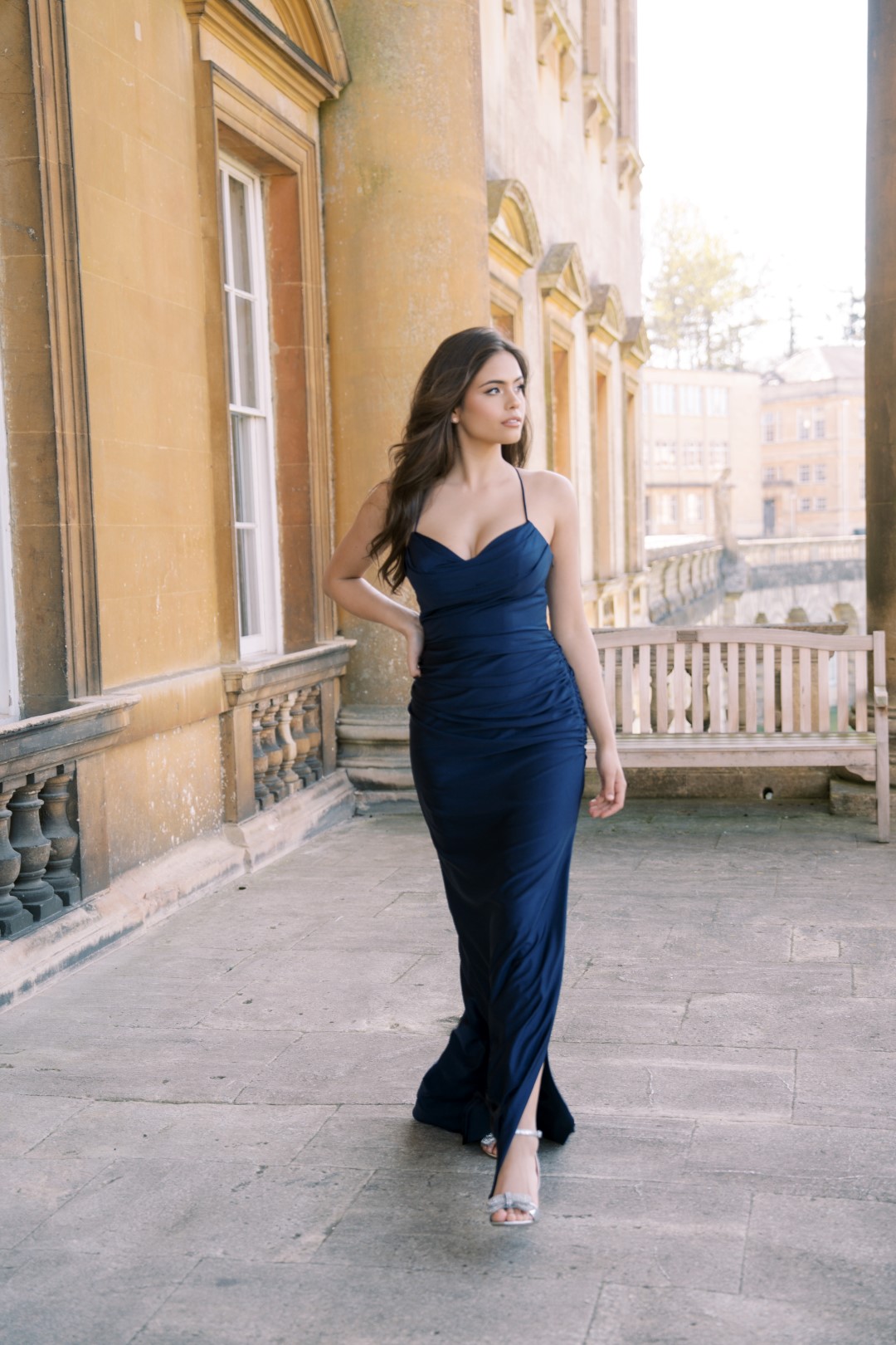 ELISA DARK RED: Fitted evening dress in stretch satin jersey with slight cowl v neck and ruching detail. Tie back and ruching to bum.