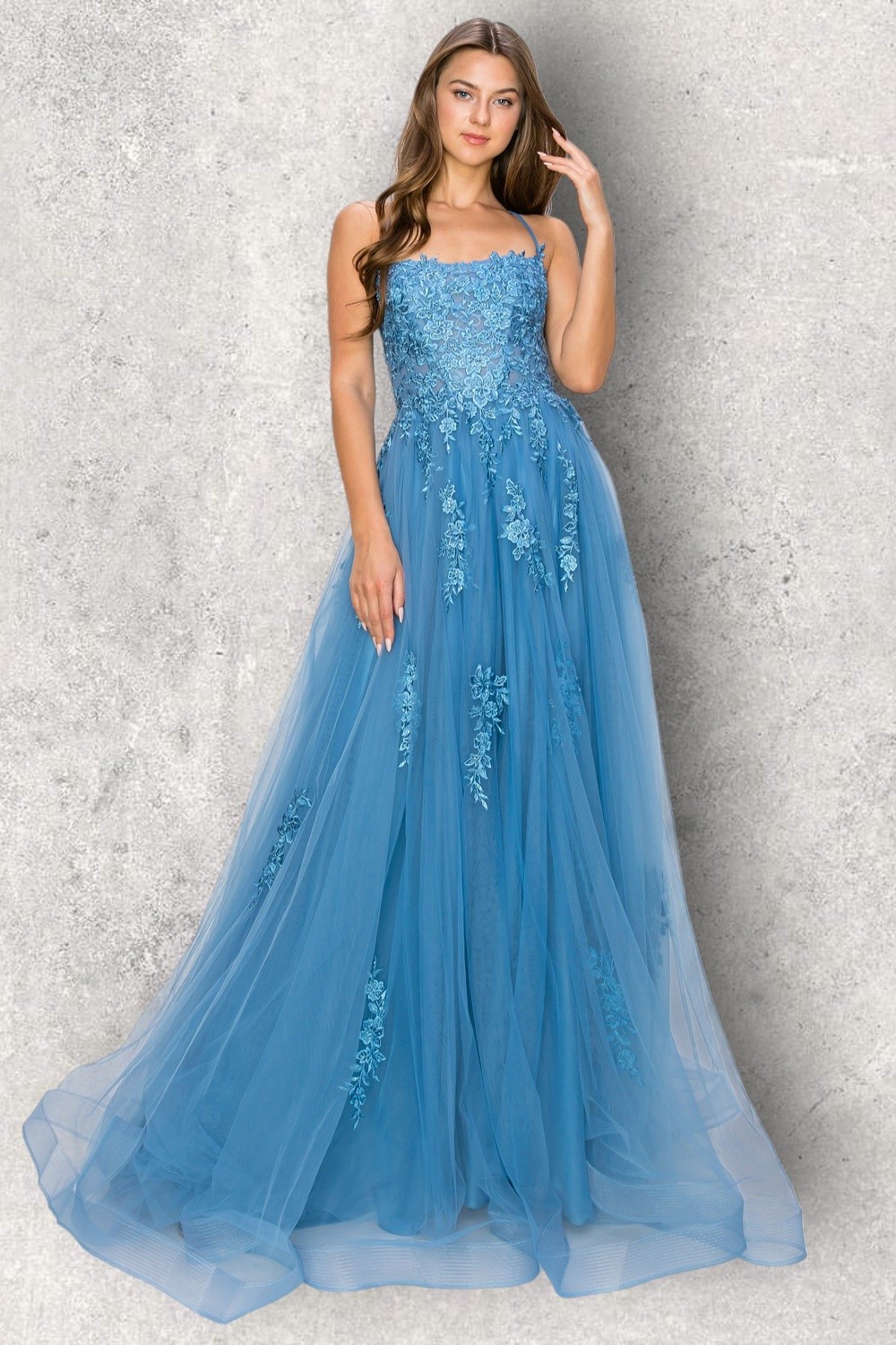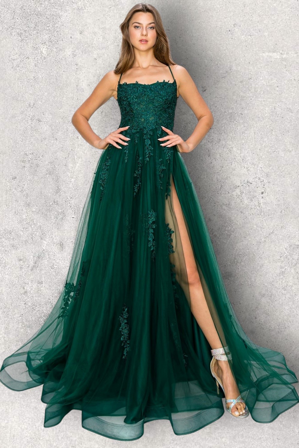 FAIRYTALE ENDINGS 8031J HUNTER GREEN: Pretty  A-line tulle dress with straight neck, straps, boned bodice with decorated bodice detail, tulle skirt and tie back.  Fab for prom.