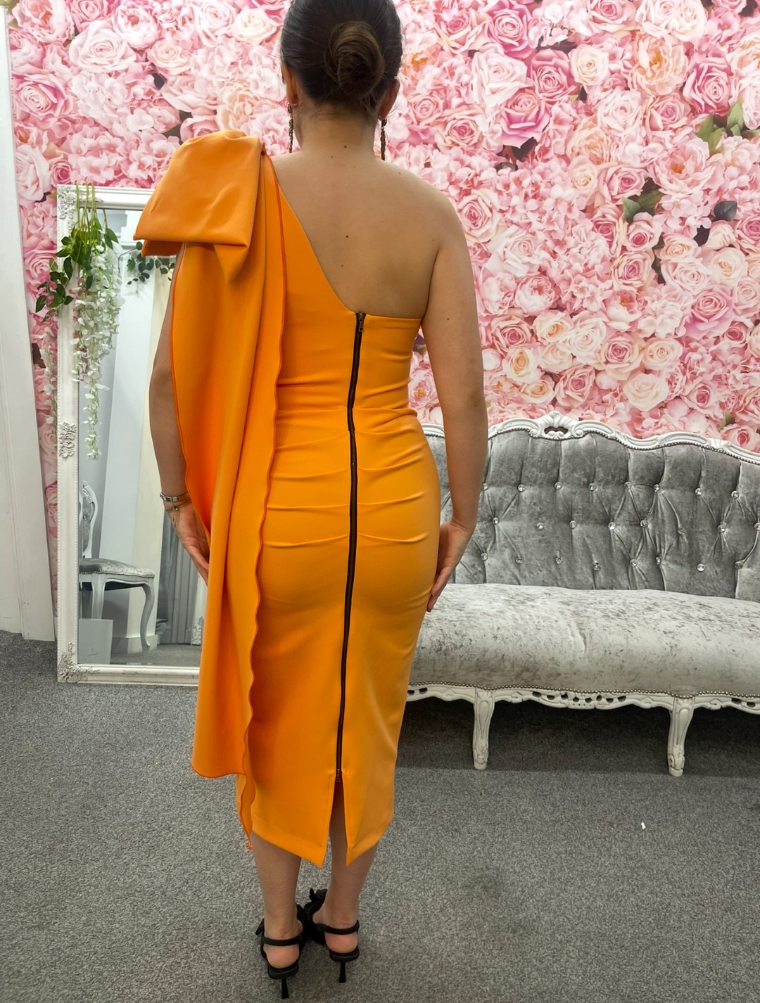 Beautifully cut asymmetric occasion dress in scuba fabric with one shoulder and bow detail to shoulder. Zip fastening to back.
