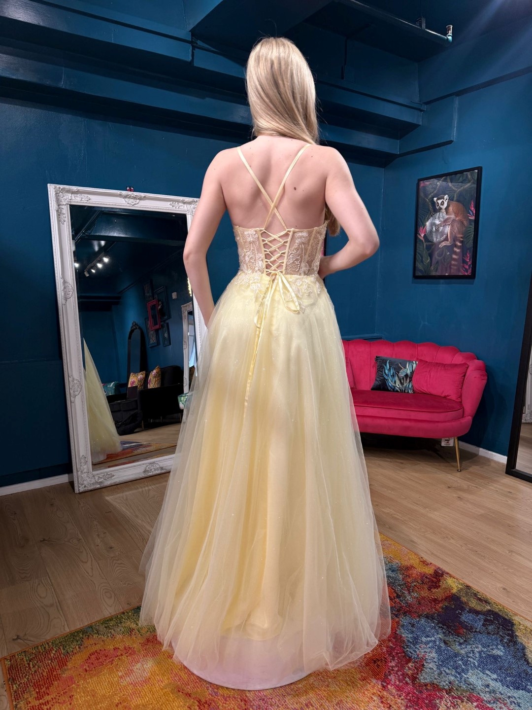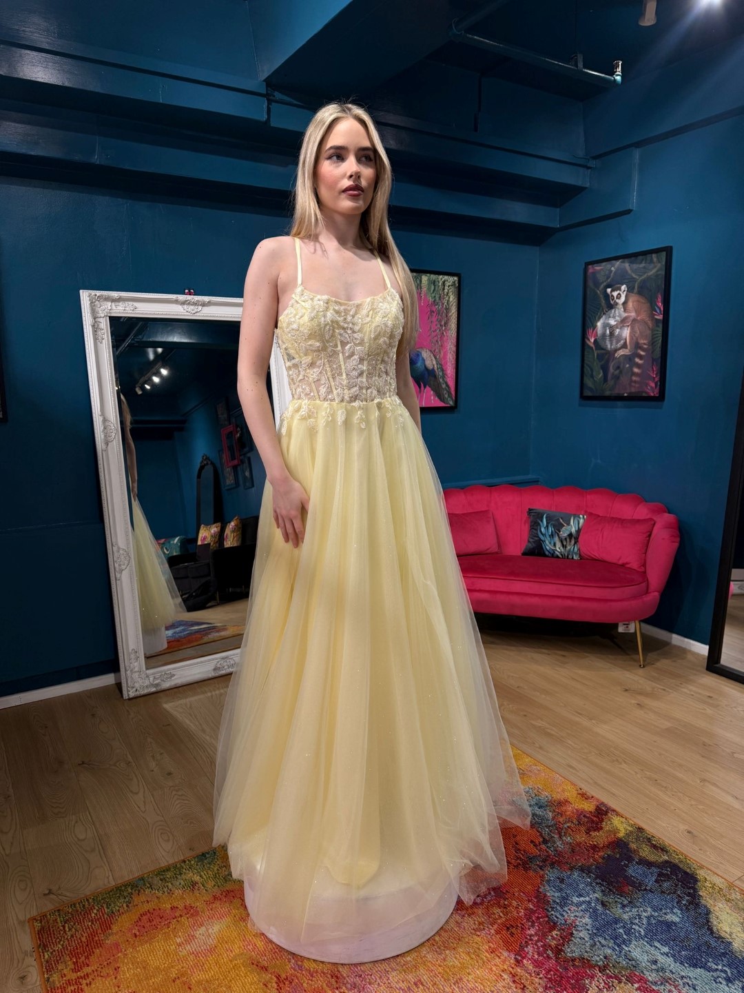 LQ DESIGNS 2607160-1 LEMON: Pretty straight neck A-line tulle dress with straps,  boned bodice with sparkling delicate beaded and embriodery leaf detail, tulle skirt and tie back.  Fab for prom, or ball.
