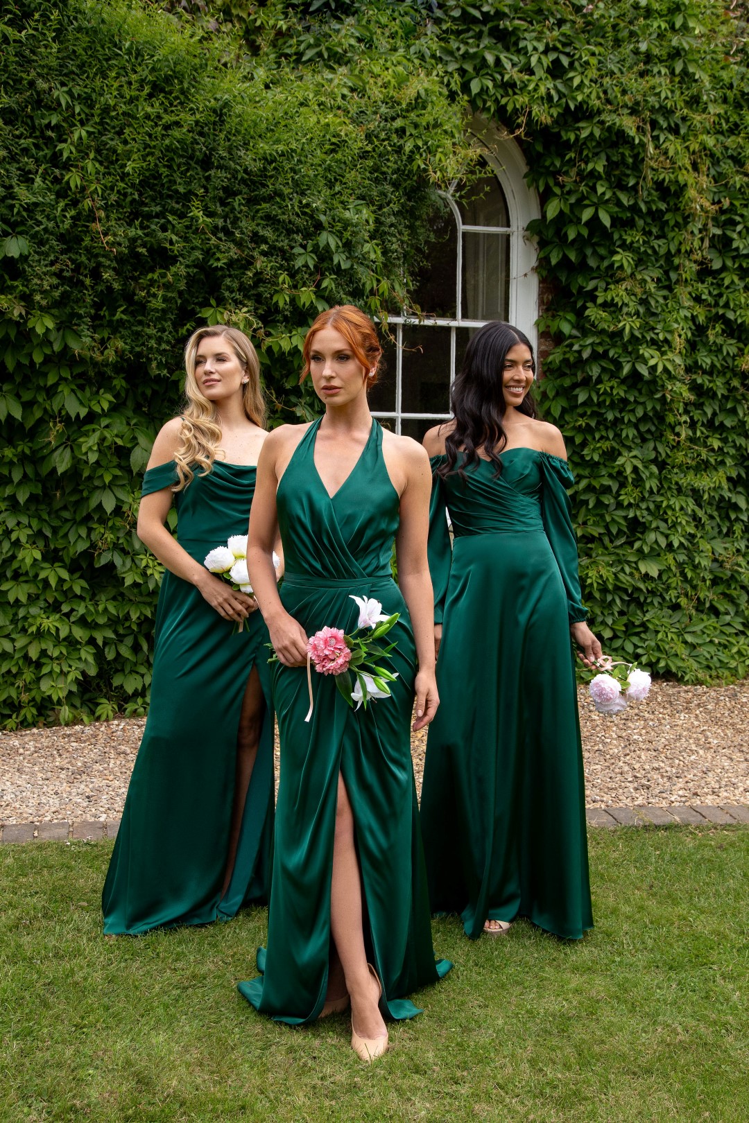 An ethereal and magical bridesmaid dress made in our finest liquid satin fabric. The dress has two fine shoulder straps, complemented by two draped off-the-shoulder flowing bardot straps. These match the draping on the bodice which accentuates your shape. The liquid satin skirt wraps over to reveal a slit at the front.